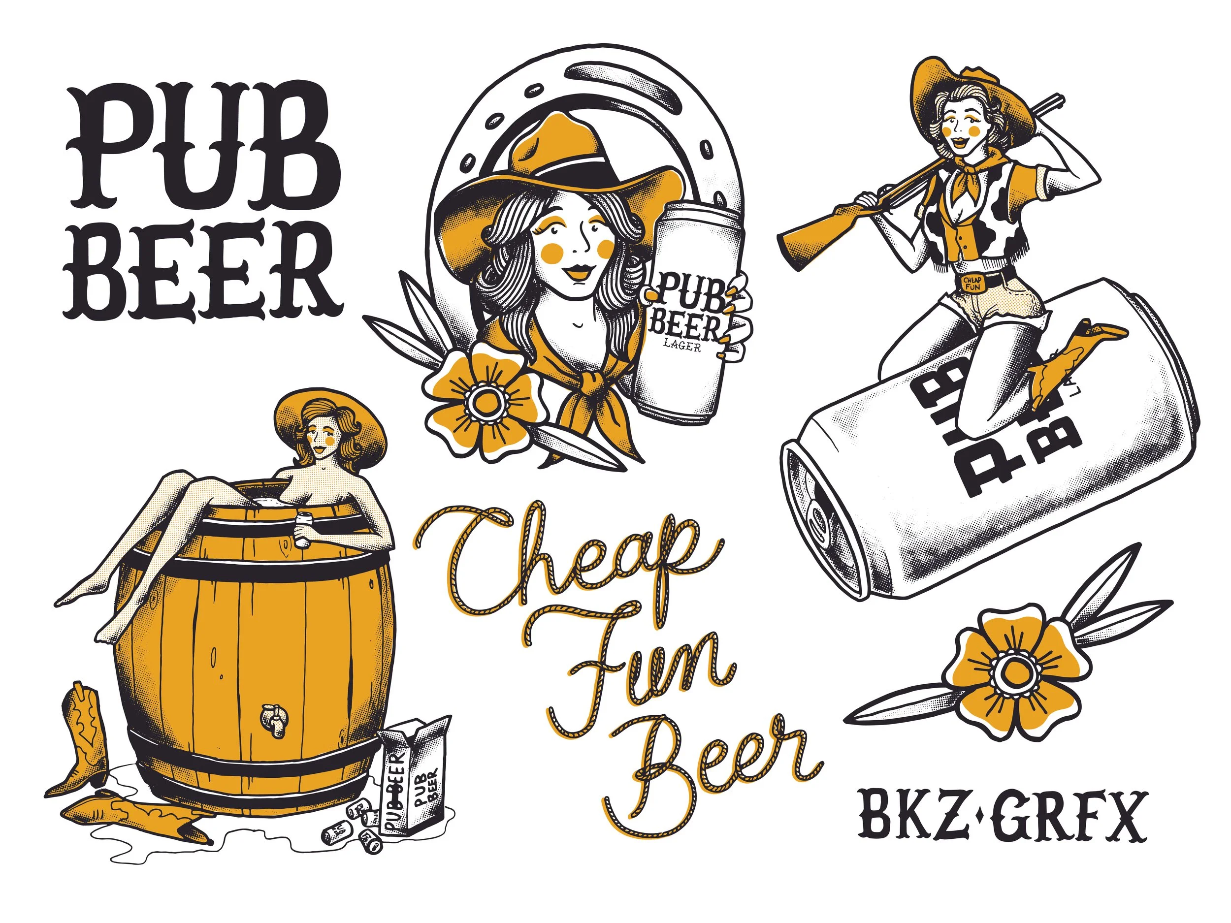 Similar to the Art Lab with Tactics, Pub Beer (10 Barrel Brewing) approached me to make an apparel collection featuring my artistic style. We chose to use a western theme mixed with pin-up girl aesthetic. This pack features 3 main graphics and 2 custom hand drawn wordmarks.